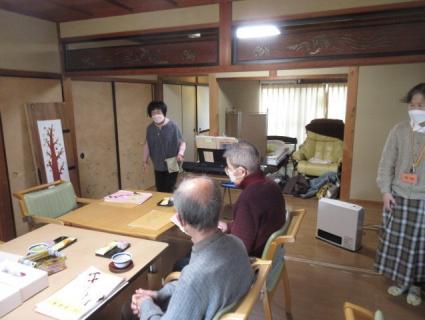 回想法のあとは絵手紙。下絵から書く方、消しゴムハンコを使われる方。