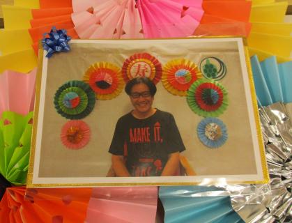 壁画の前で撮影した写真をラッピングして敬老の日のお祝いの記念品としてお渡しさせていただきました。