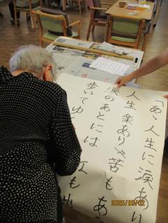 「あゝ人生に涙あり」の歌詞を模造紙に大きく書いていただく作業や劇中に使った小道具の小判やカツラの作製はご利用者の方々にご協力いただきました。