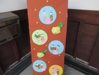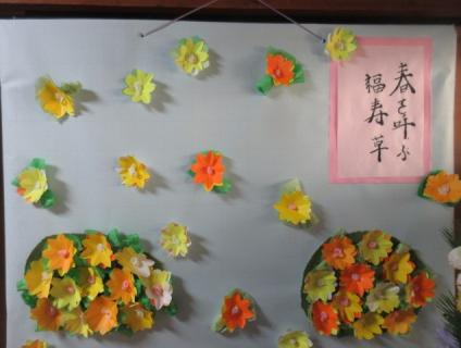2月もいろんな作品に取り組んでくださいましたよ(*^-^*)玄関の壁画にはかわいらしい福寿草。