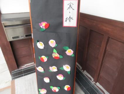 寒椿はフェルトや和柄の布を使い、作りました。