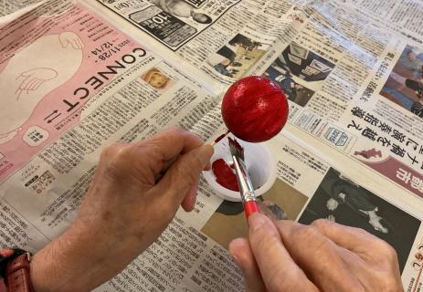 ご利用者が丁寧に芋の蔓で形を作り、発砲スチロールの大小様々な球体に色を付けて、可愛い飾りを作って下さいました。