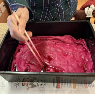 お正月に向けてランチョンマットを新調しましょうと、年末から布を染め、ご利用者に協力をしてもらいなが手縫いで縫製。