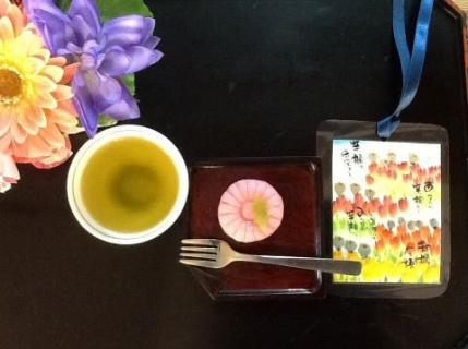 おやつの写真の右横に写っている物は、敬老のお祝いとしてお渡しした職員お手製の『しおり』♪