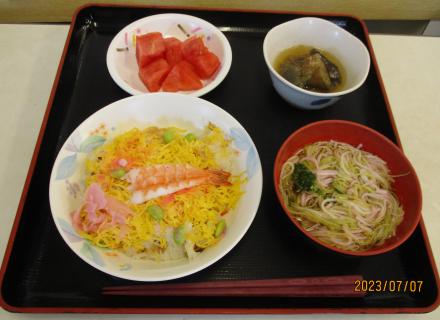 お昼ご飯は、星形のハンバーグ・コロッケ、切り口が星形のオクラ入りコンソメスープで、七夕をイメージしたメニューでした☆彡