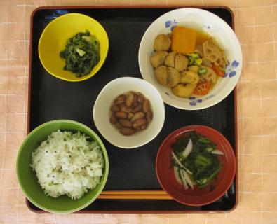 また昼食に、なんきん(かぼちゃ)、れんこん、にんじんを使ったお料理<運のつく炊き合わせ ユズ風味>をご提供させていただきました。